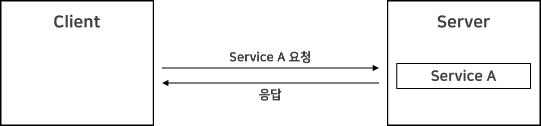 ๊ฐ์ฅ ๋ง์ด ์ ํ๋ ํด๋ผ์ด์ธํธ-์๋ฒ ๊ตฌ์กฐ ์ ๋๋ค. ํด๋ผ์ด์ธํธ๊ฐ Service A๋ฅผ ์์ฒญํ๋ฉด ์๋ฒ๊ฐ ์๋ต ํฉ๋๋ค.