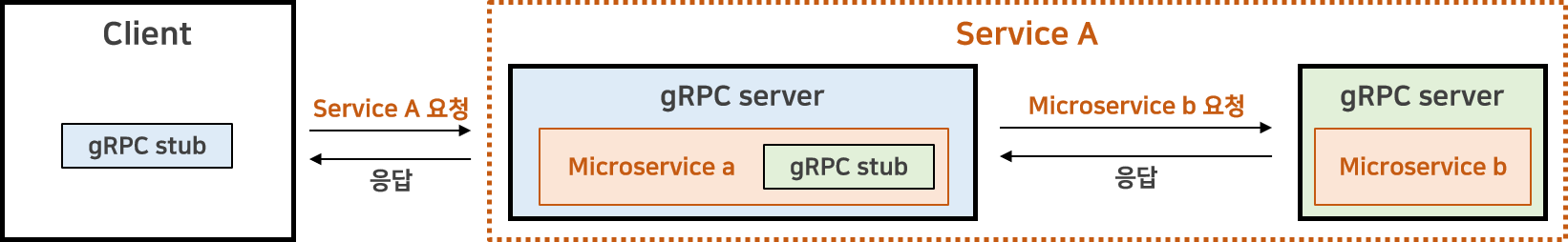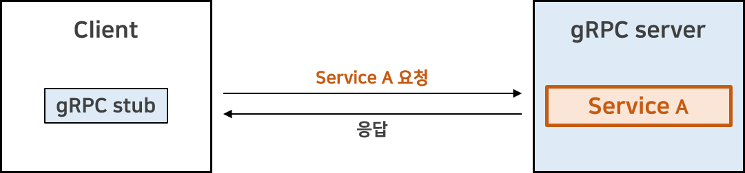 ์ ๊ตฌ์กฐ์ gRPC์ ์ฉํ์์ต๋๋ค. ํด๋ผ์ด์ธํธ๊ฐ stub์ ํตํด Service A๋ฅผ ์์ฒญํ๋ฉด, gRPC ์๋ฒ๊ฐ ์๋ต ํฉ๋๋ค.