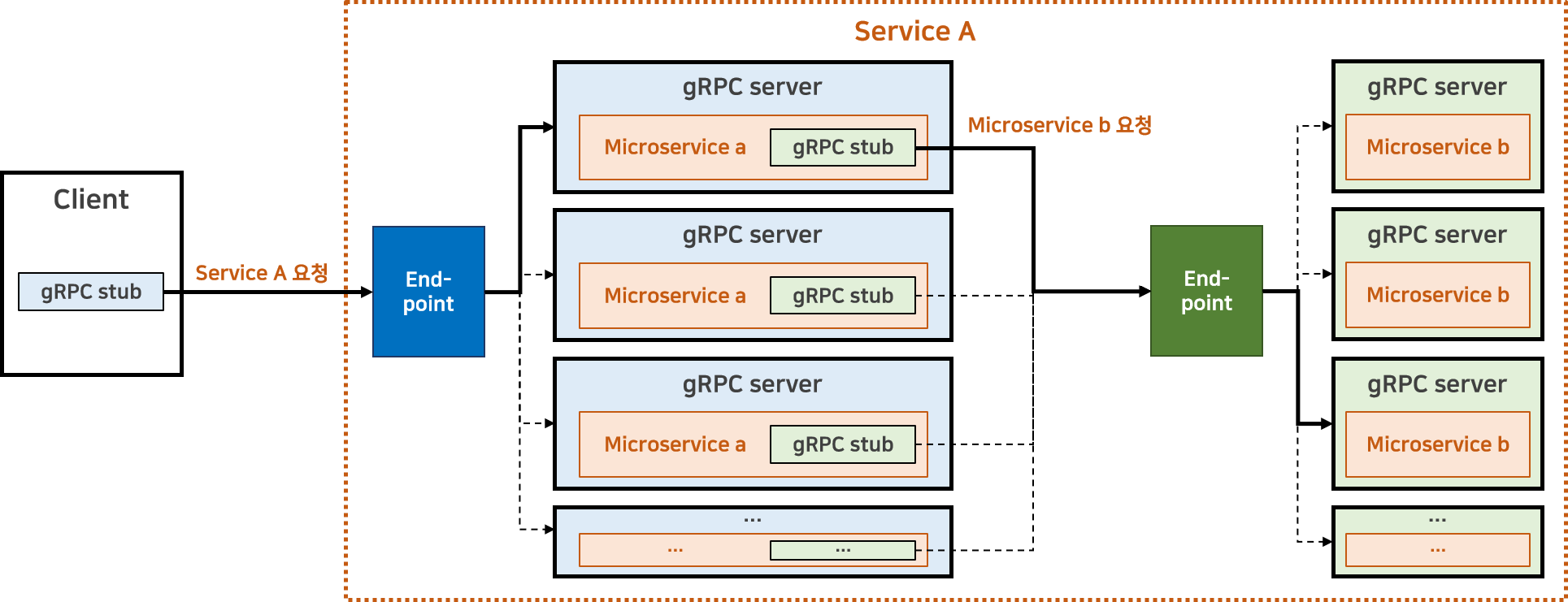 - ํด๋ผ์ด์ธํธ๋ stub์ ํตํด Endpoint๋ก Service A๋ฅผ ์์ฒญ